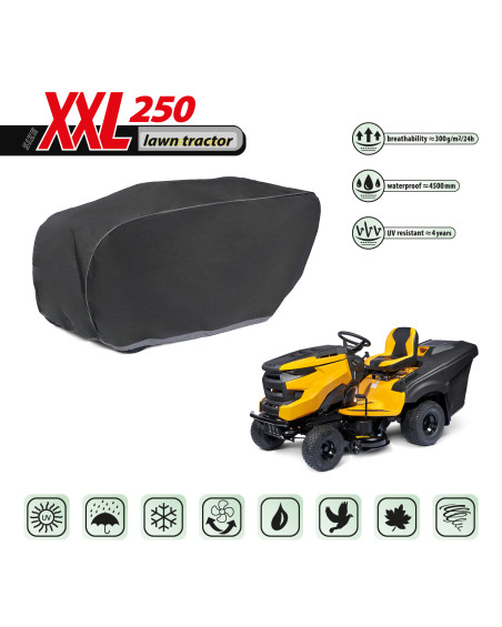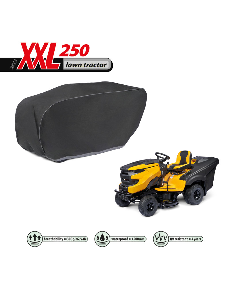 Całoroczny pokrowiec do ochrony spalinowego traktorka ogrodowego przechowywanego na zewnątrz przed niekorzystnym wpływem środowiska. Dzięki specjalnej konstrukcji woda podczas deszczu spływa po pokrowcu nie wnikając pod pokrowiec, a para wodna odprowadzana jest na zewnątrz. Chroni traktorek przed deszczem, śniegiem, szronem i promieniami słonecznymi (szkodliwym UV) oraz zanieczyszczeniami jak pył, ptasie odchody i soki z drzew. Ogranicza korozję i starzenie się elementów z tworzyw sztucznych, chroni przed blaknięciem i matowieniem lakieru oraz elementów chromowanych. Pokrowiec jest w pełni odporny na wszystkie warunki atmosferyczne.